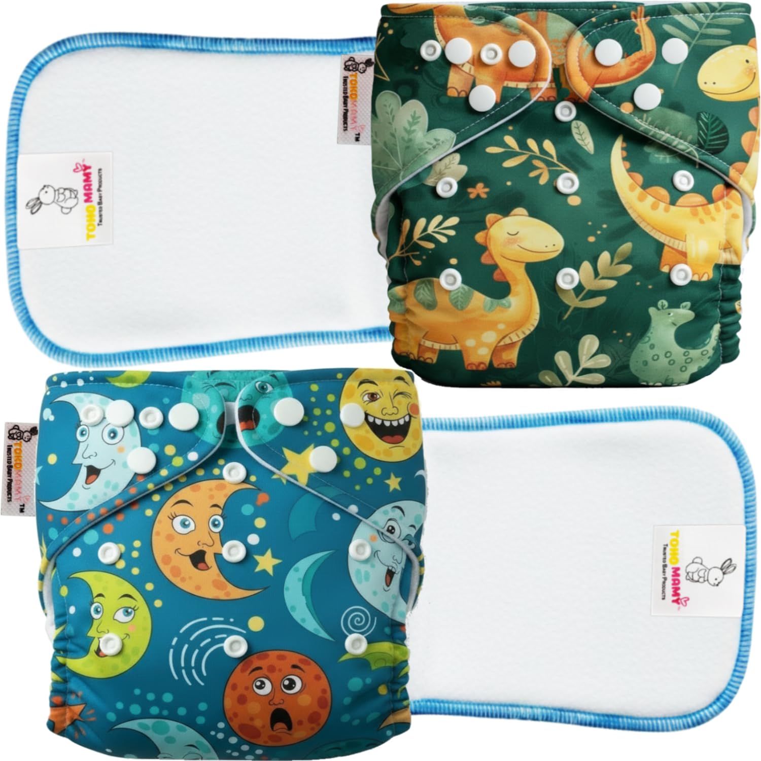 TOKOMAMY Reusable Cloth Diaper for Newborn Babies 0–3 Years (5–18kg) | Leakproof Washable Adjustable Pocket Cover Liner with 5-Layer Insert Pad | Rash-Free, (Pack of 2 Diaper + 2 Insert Pad) Free Size